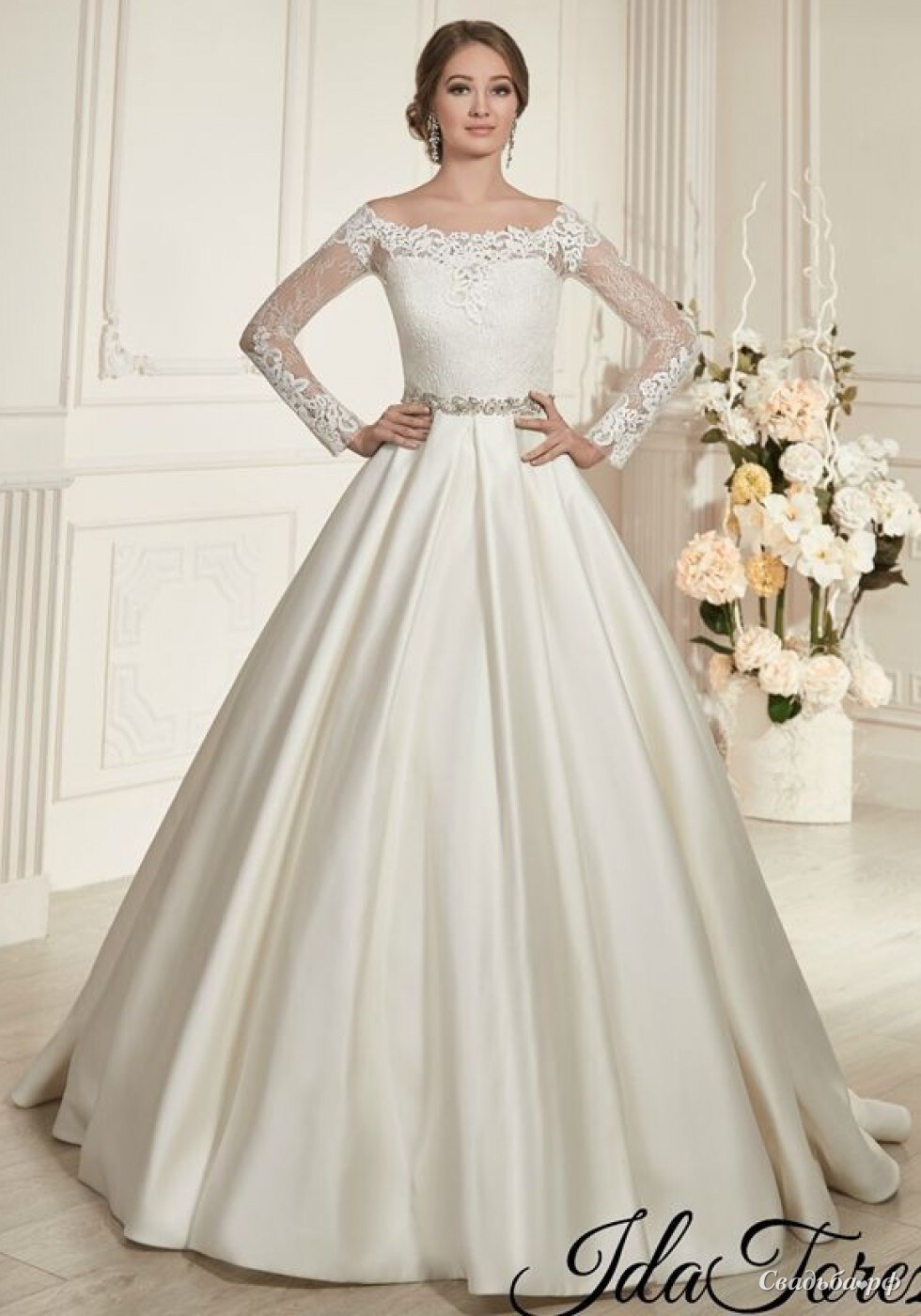 Поистине королевское пышное свадебное платье отличается торжественностью и сдержанностью декора. Лаконичный корсет с вырезом в форме лодочки дополнен длинными рукавами и декорирован нежным кружевом. Талия подчеркнута расшивкой из страз Сваровски. Пышная атласная юбка поражает своим благородством. В таком наряде вы поразите всех!