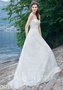В этом элегантном свадебном платье строгие формы удивительно гармонично сочетаются с изысканными материалами. Модель полностью расшита искусным рельефным кружевом. Талия подчеркнута широким фатиновым поясом, украшенным изысканной жемчужной расшивкой.