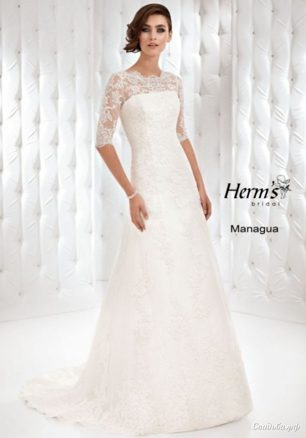 Эффектное кружевное свадебное платье идеально подчеркивает все достоинства фигуры. Зона декольте закрыта. Модель дополнена полупрозрачными кружевными рукавами до локтя. В этом наряде невеста будет неотразима!
