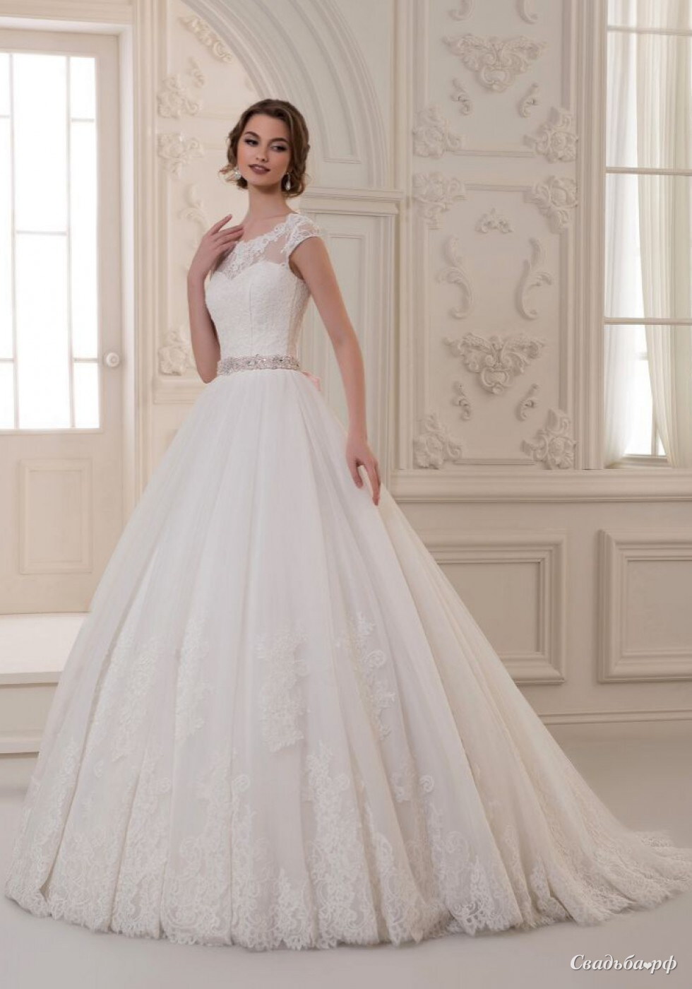 Роскошное свадебное платье в испанском стиле впечатлят своей нежностью и элегантностью. Кружевной лиф дополнен закрытой зоной декольте. Талия подчеркнута атласной лентой нежно-розового цвета, вручную расшитый жемчугом, стеклярусом и стразами Сваровски. Длинная струящаяся фатиновая юбка расшита роскошными кружевными аппликациями, переходящими на шлейф.