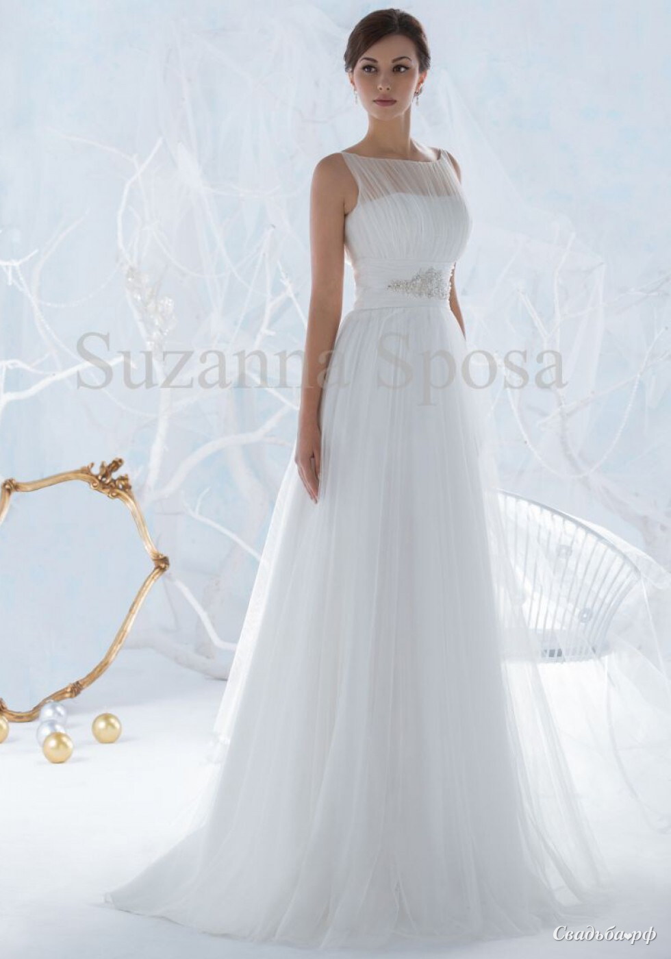 Закрытое свадебное платье. Выполнено из тончайшего нежного фатина, который слегка драпирован, что придает модели легкую невесомость, линия талии расшита хрусталиками, спинка на шнуровке.