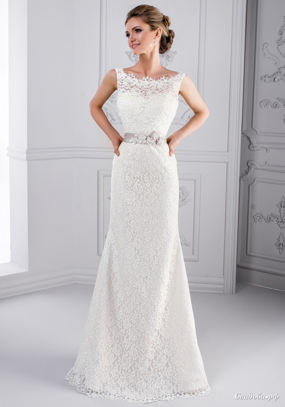 Нежное закрытое свадебное платье прямого силуэта эффектно подчеркивает женственные изгибы фигуры. Модель выполнена из великолепного кружева, что придаёт образу особый шик. Элегантный образ для стильной леди!