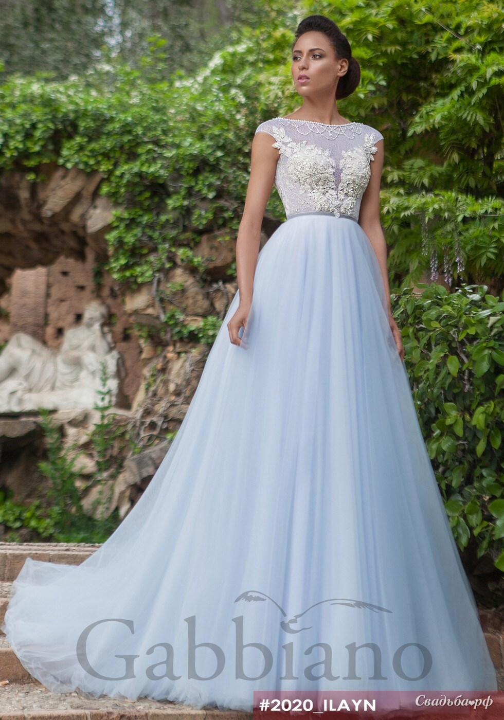 нежное свадебное платье небесного цвета с кружевной маечкой