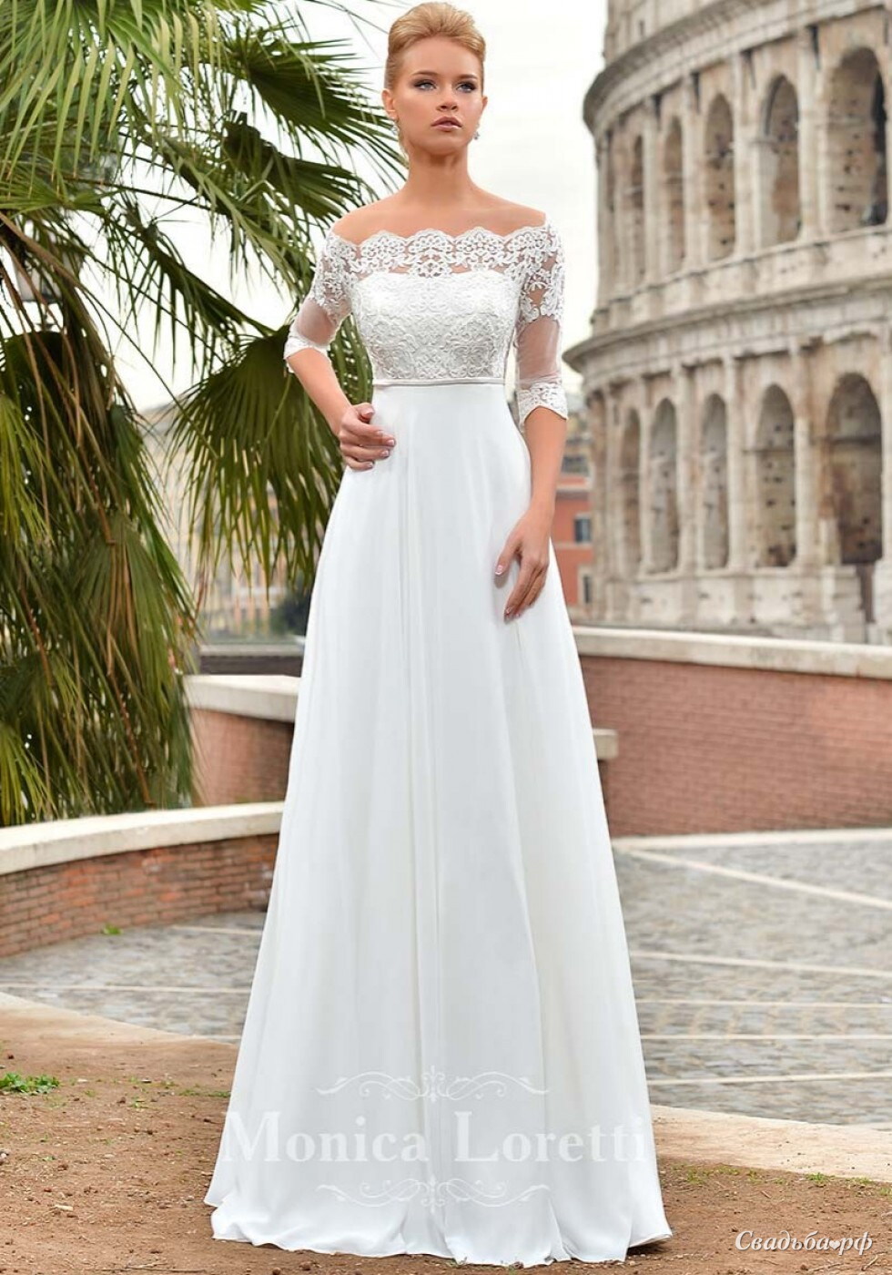 Прямое свадебное платье с открытыми плечами. Восхитительное свадебное платье от итальянского бренда Monika Loretti. Изящный кружевной корсет с рукавами и юбкой из шифона. Коллекция свадебных платьев 2016 года.