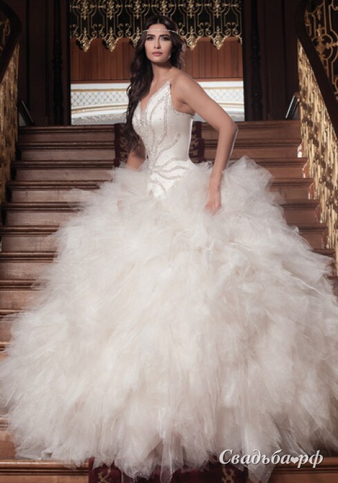 Свадебное платье в стиле "принцесса" с очень пышной фатиновой юбкой с так называемыми "платочками", которые придают юбке необычайную пышность. Открытый верх, вырез "сердечком". Корсет расшит стразами и бисером в форме расходящихся от центра лепестков. Ручная работа.