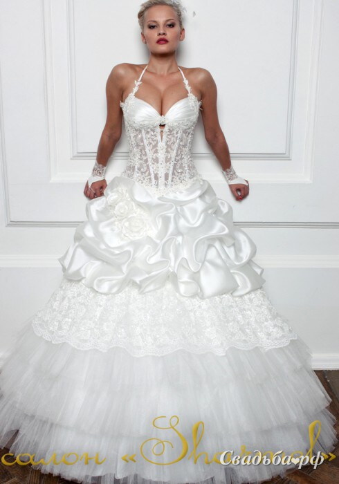 Корсет выполнен из полупрозрачного кружева и эффектно подчёркивает все достоинства фигуры. Пышная многоярусная юбка из сочетания фатина кружева и тафты. Данная модель отшивается до 66 размера.