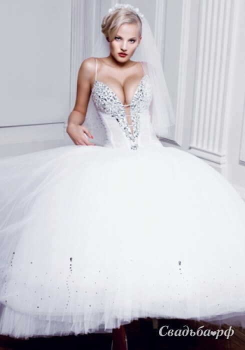 украшенный камнями, очень эффектно выглядит на фоне открытой зоны декольте. Широкая пышная юбка до пола