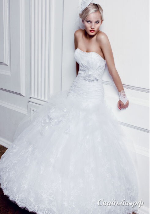 Роскошное свадебное платье отечественного производства способно удовлетворить даже самую требовательную модницу. Заниженный корсет с открытой зоной декольте и лёгкой драпировкой дополнен крупным бантом под грудью. Модель выгодно подчёркивает все соблазнительные изгибы фигуры. От середины бедра начинается пышная юбка из кружева.