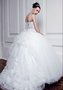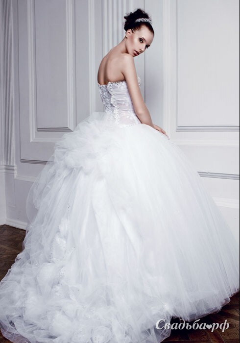 Поистине королевское свадебное платье А-силуэта от лучших отечественных дизайнеров. Изящный корсет с открытой зоной декольте привлекает внимание к бюсту. Пышная юбка с объёмными сборками сзади дополнена кокетливым шлейфом из полупрозрачной ткани. В таком роскошном наряде вы непременно окажетесь в центре внимания.