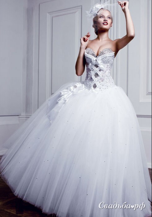 Поистине королевское свадебное платье А-силуэта придётся по душе самым стильным невестам. Элегантный корсет с пикантной зоной декольте вручную расшит сверкающими камнями и декорирован лентами. Кокетливый бантик привлекает внимание к бюсту. Пышная юбка из невесомой ткани придаёт образу воздушность и торжественность.