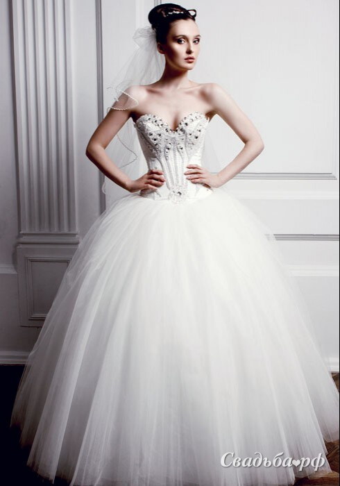 Белоснежное свадебное платье А-силуэта – это безупречная классика. Элегантный корсет с соблазнительной зоной декольте вручную расшит сверкающими кристаллами и бисером Модель выгодно подчёркивает все женственные изгибы фигуры. Пышная юбка струится до самого пола. В таком роскошном наряде вы будете в центре внимания.