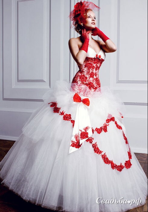 Потрясающее свадебное платье от лучших отечественных дизайнеров придётся по душе самым дерзким модницам. Эффектное сочетание белого и красного придаёт наряду особый шик. Заниженный корсет с открытой зоной декольте выгодно подчёркивает все женственные изгибы фигуры. От середины бедра начинается пышная юбка с объёмными сборками и бантом.