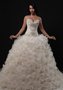 Это оригинальное свадебное платье придётся по душе самой стильной и романтичной натуре, мечтающей почувствовать себя сказочной принцессой. Заниженный корсет с открытой зоной декольте украшен затейливой вышивкой, бисером и сверкающими камнями. Пышная юбка со множеством воланов из тонкой ткани поможет создать неповторимый образ.