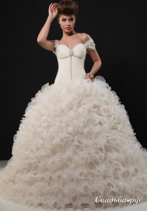 Очень лёгкое и удивительно воздушное свадебное платье отечественного производства станет украшением даже самой привередливой модницы. Драпированный корсет с приспущенными плечиками и сверкающей вышивкой эффектно подчёркивает бюст. Пышная юбка с многоярусными воланами из невесомой ткани смотрится божественно! Вы будете неотразимы!