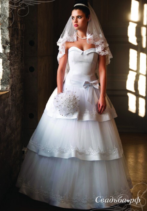 Изысканное свадебное платье с оригинальными отворотами по верхнему краю корсета. Пышная юбка состоит из трёх ярусов. Края каждого яруса из лёгкой ткани окантованы более плотным материалом и расшиты сверкающими камнями. Очаровательный бантик придаёт наряду игривость. Платье представлено в широком размерном ряду – до 60 размера.