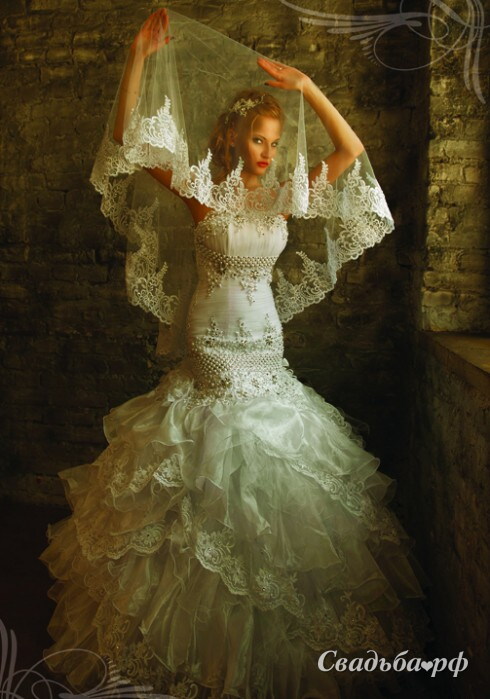 Если Вы мечтаете почувствовать себя прекрасной русалкой, то этот свадебный наряд создан специально для Вас. Заниженный корсет украшен вышивкой, кружевными вставками и крупными жемчужинами – атрибутом настоящей царицы морей! От середины бедра начинается пышная юбка со множеством ярусов из невесомой ткани. Каждый волан по краю окантован кружевом.