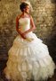 Романтичное свадебное платье для самых нежных натур. Заниженный корсет с лёгкой драпировкой украшено объёмными узорами на груди. Пышная юбка с несколькими ярусами из ткани различной фактуры смотрится свежо и необычно. Некоторые воланы украшены сверкающей вышивкой. Представленная модель может быть со шлейфом, так и без него.