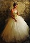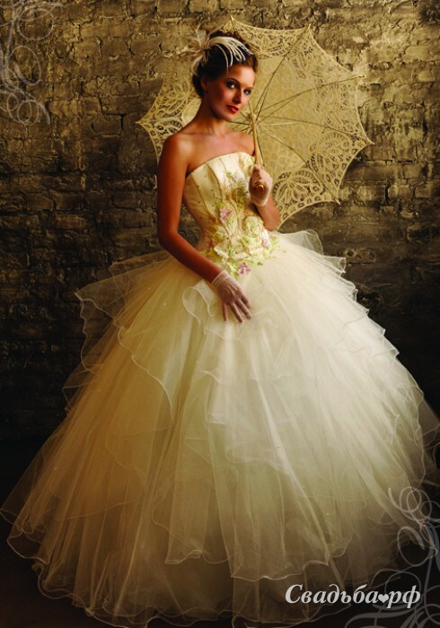 Весеннее и очень солнечное платье с цветочным декором на корсете придётся по вкусу жизнерадостным натурам. Модель отлично подчёркивает все достоинства фигуры. Пышная юбка с многоярусными воланами из полупрозрачной ткани помогает создать невесомый образ. Кажется, что невеста вот-вот воспарит над землёй. Модель из новой коллекции 2014 года.