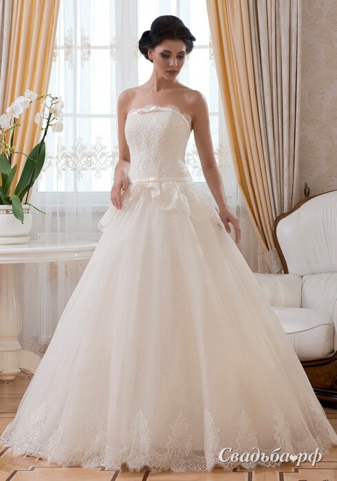 Очаровательное свадебное платье с изысканной кружевной отделкой. Строгий корсет модели полностью обтянут кружевом с изумительно красивыми цветочными узорами. Верхний край прямого лифа и заниженная линия талии выделены атласной лентой с кокетливым бантиком. Игривая кружевная баска идеально сочетается с кружевом, проходящим по краю пышной юбки.