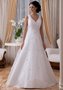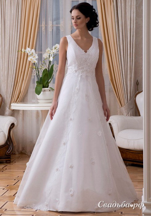 Роскошное свадебное платье с элегантным V-образным вырезом. Корсет модели украшен лёгкой драпировкой и расшит удивительно красивыми кружевными узорами с бисером и бусинами. Отдельные кружевные элементы расположены по всей длине великолепной пышной юбки. Настолько изысканный наряд позволит невесте почувствовать себя настоящей принцессой.