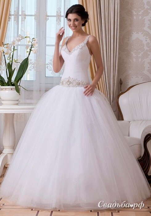 Роскошное свадебное платье с драпированным корсетом. По контуру фигурного лифа и бретелям проходит изысканная вышивка, украшенная сверкающими стразами. Заниженная линия талии эффектно выделена декоративным поясом, также расшитым стразами. Великолепная пышная юбка невесомым облаком окутывает стройные ножки прекрасной невесты.