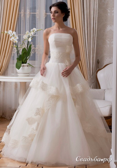 Элегантное свадебное платье с прямым лифом. Корсет модели украшен стильной мелкой драпировкой. Линия талии выделена широким кружевным поясом. Пышная юбка состоит из нескольких невесомых оборок с кружевным орнаментом по краю. Прекрасный вариант наряда для нежной, романтичной и, в то же время, изысканной и утончённой невесты.
