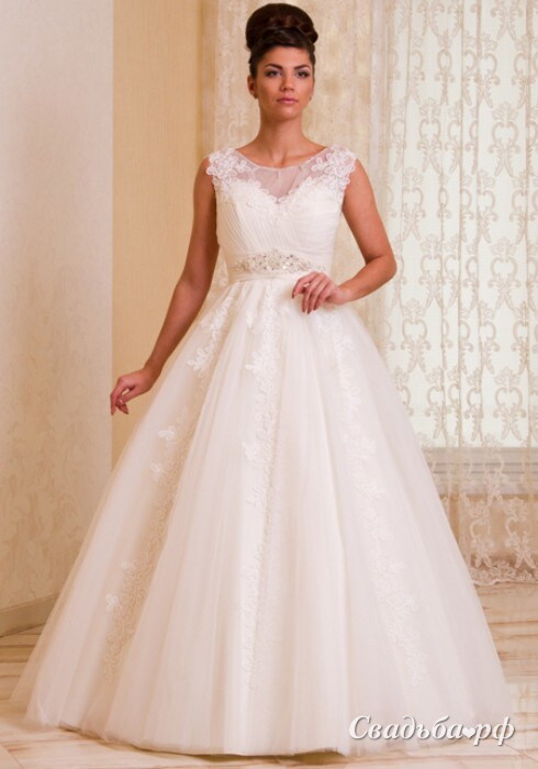 Нежное и романтичное свадебное платье с завышенной линией талии. Драпированный корсет модели покрыт тончайшей полупрозрачной тканью, украшенной изысканными кружевными узорами. Завышенная линия талии эффектно выделена широким поясом с оригинальной вышитой композицией. Пышная юбка также украшена симпатичной цветочной вышивкой.