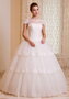 Очаровательное свадебное платье идеально подойдёт для современной принцессы. Тонкое кружево с красивыми цветочными узорами обтягивает корсет модели, формирует короткий рукавчик, кокетливо прикрывает зону декольте и окаймляет соблазнительный вырез на спинке. Пышная юбка состоит из трёх огромных оборок с красивым кружевным орнаментом.