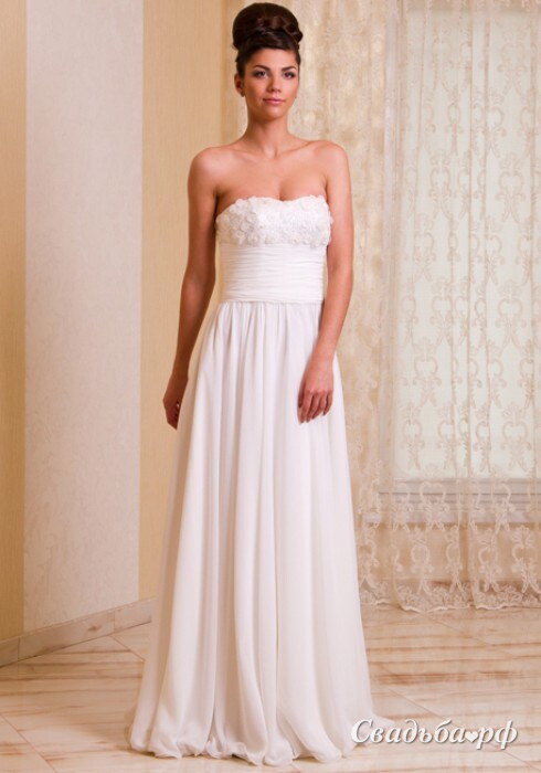 Утончённое и изысканное свадебное платье с мягкой струящейся юбкой идеально подойдёт для создания нежного и романтичного образа. Корсет модели сформирован из тонкой драпированной ткани и стянут шнуровкой. Открытый фигурный лиф украшен великолепной объёмной вышивкой в виде нежных цветочков. Лёгкая юбка спокойными волнами ниспадает на пол.