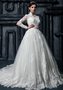 Эффектное свадебное платье с закрытым лифом и длинными рукавами. Верхняя часть модели полностью выполнена из изысканного кружевного полотна с ажурными узорами. Линия талии выделена декоративным поясом из сверкающих стразов. Длинная, очень пышная юбка со шлейфом также украшена отдельными кружевными элементами по всей длине.