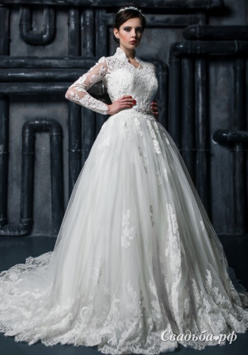 Эффектное свадебное платье с закрытым лифом и длинными рукавами. Верхняя часть модели полностью выполнена из изысканного кружевного полотна с ажурными узорами. Линия талии выделена декоративным поясом из сверкающих стразов. Длинная, очень пышная юбка со шлейфом также украшена отдельными кружевными элементами по всей длине.