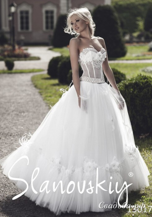 Оригинальное свадебное платье А-силуэта создано для самых дерзких модниц. Пышная юбка из итальянского фатина украшена по нижнему краю декоративными цветами и лебяжьим пухом. Полупрозрачный корсет с открытой зоной декольте расшит стразами Swarovski. Модель подчёркивает талию и зрительно увеличивает бюст. Спинка на удобной шнуровке.