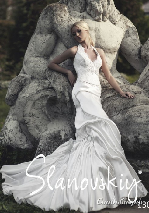 Свадебное раздельное платье силуэта Русалочка (Рыбка). Корсет с американской проймой (бретель через шейку). Декоративный атласный поясок на талии украшен элементами Сваровски. Весь корсет из итальянского кружева. Шлейф необычно задрапирован и украшен брошью от Swarovski. Юбка на молнии, корсет на шнуровке.