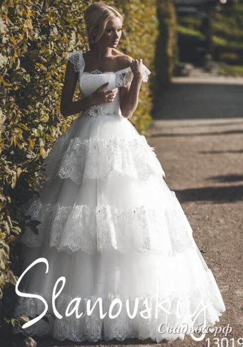 Шикарное свадебное платье от Slanovskiy силуэта Принцесса, с отстегивающимися бретелями. Пышная трехъярусная фатиновая юбка украшена французским кружевом и лебяжьими перьями. Корсет из французского кружева украшен декоративными цветами и стразами Swarovski. Спинка на шнуровке. Каждая невеста в таком наряде почувствует себя настоящей Принцессой.