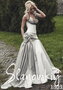 Эксклюзивное свадебное платье А-силуэта из посеребренной жаккардовой ткани. Раздельное. Корсет имеет тоненькую бретель, украшенную стразами Сваровски. Лиф платья задрапирован и украшен в тон бретели. Юбка наряда на молнии. На боку имеет декоративный бант. Небольшой шлейф. Неповторимое свадебное платье!