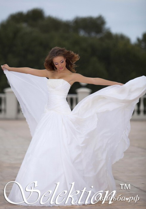Лаконичное свадебное платье с заниженным корсетом придётся по душе самым элегантным невестам. Лёгкая драпировка корсажа с открытой зоной декольте зрительно увеличивает бюст и выгодно подчёркивает талию. Лиф и тонкий поясок вручную расшиты жемчугом. Пышная юбка без лишнего декора придаёт образу романтичность. Спинка наряда на удобной шнуровке.