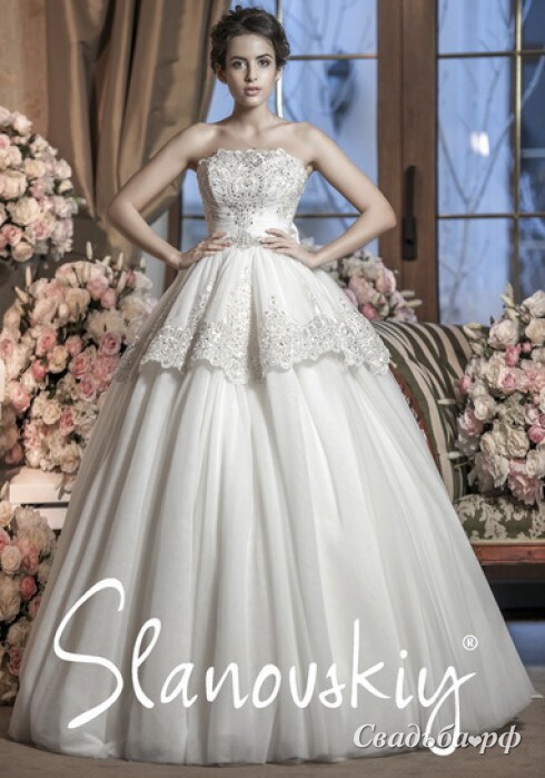 Сказочное свадебное платье с баской создано для настоящей королевы. Пышная фатиновая юбка с изящными складками и крупным бантом сзади. Лиф и баска украшены стразами Swarovski и японским бисером. Корсет платья на шнуровке. Модель зрительно увеличивает бюст и подчёркивает талию. Головной убор входит в комплект к свадебному платью.