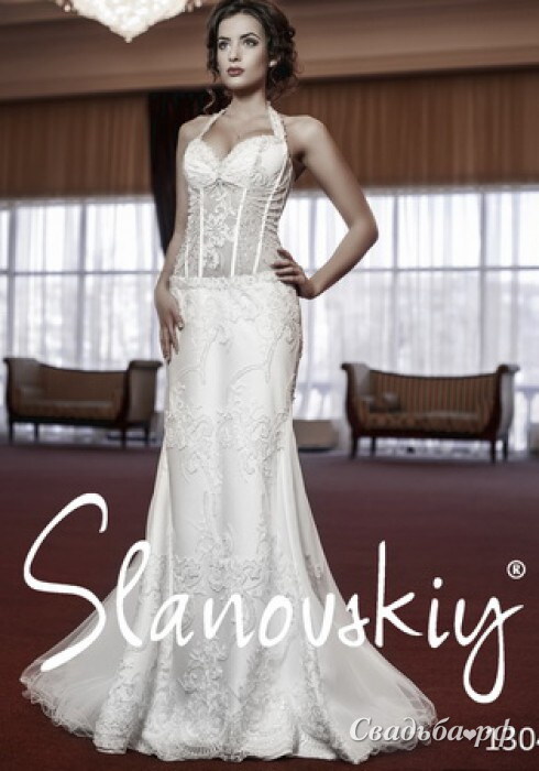 Неповторимое платье 13047 силуэта Рыбка (Русалочка). Полупрозрачный корсет с бретелью через шейку украшены стразами Сваровски и японским бисером. Платье с использванием итальянского кружева. Сзади юбка от колен - фатиновая, что придает модели платья изюминку. Спинка платья на шнуровке.