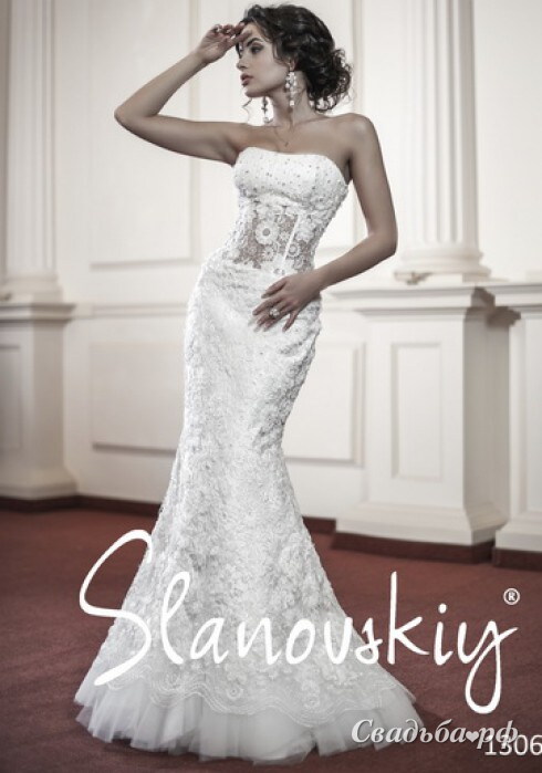 Неповторимое свадебное платье силуэта Рыбка (Русалочка) с небольшим фатиновым шлейфом. Корсет полупрозрачный, по желанию невесты можно исправить. Все платье из французского неотразимого кружева. Платье украшено стразами Swarovski. Такое платье придаст невесте утонченность и элегантность.
