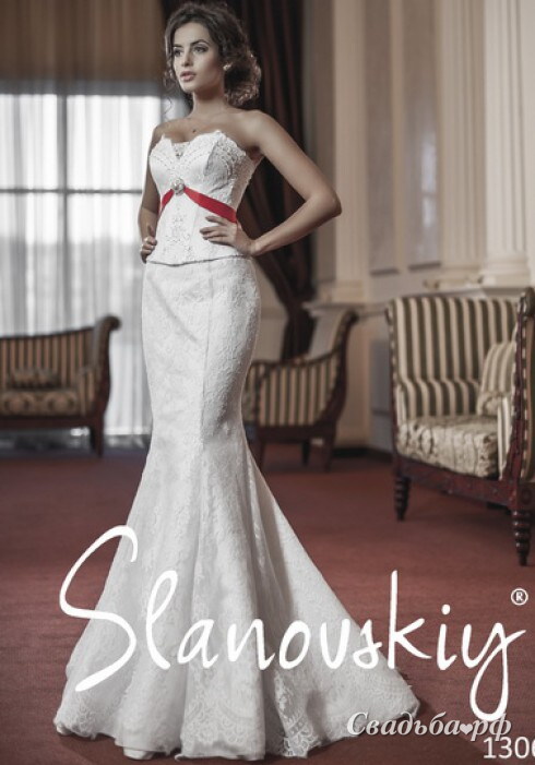 Раздельное свадебное платье силуэта Рыбка (Русалочка). Корсет наряда украшен японским бисером и жемчугом. Под грудью декоративный поясок с брошью Swarovski и декоратиная шнуровка платья может быть выполнен в любом цвете. Пояс на спинке превращается в бант с использованием броши Swarovski. Платье выполнено из французского кружева. Небольшой шлейф.