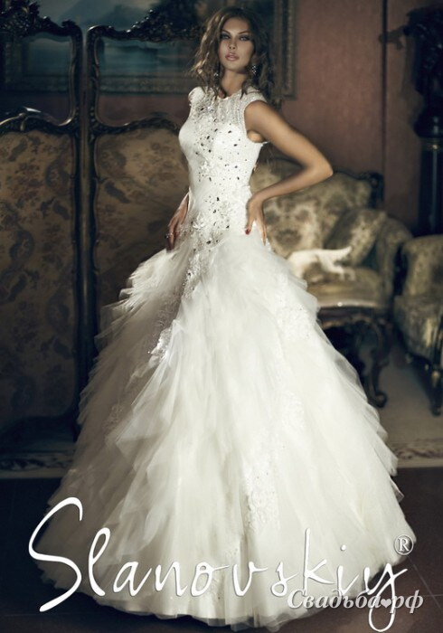 Элегантное свадебное платье А-силуэта поможет Вам почувствовать себя настоящей принцессой. Заниженный корсет со скромной зоной декольте полностью расшит японским бисером и стразами Swarovski. Пышная фатиновая юбка с оригинальными вертикальными воланами дополнит образ прекрасной невесты. В таком наряде Вы будете на высоте!