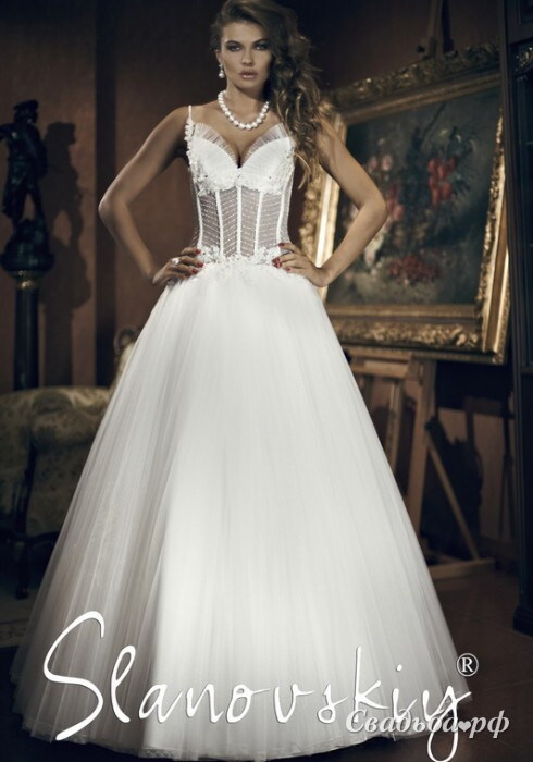Свадебное платье с пышной фатиновой юбкой для настоящей принцессы. V-образный вырез лифа, тонкие бретели, полупрозрачный корсет, украшенный японским бисером, стразами Сваровски и декоративной вышивкой. Полупрозрачный корсет можно закрыть по желанию невесты.