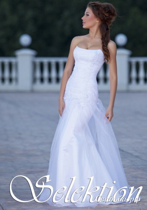 Силуэт платья Рыбка (Русалочка). Корсет платья расшит вручную кружевом, прилегает до бедра, что невероятно хорошо подчеркнет фигуру обладательницы платья. От бедра – фатин, что придает образу легкость и элегантность. Спинка платья на молнии и на шнуровке.