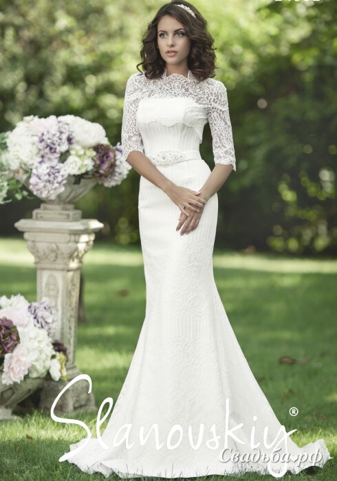 Идеальное свадебное платье силуэта русалочка предлагается в белом и кремовом цветах. Платье выполнено из плотного атласа и по всей длине покрыто нежнейшим кружевом. Линия декольте прямая, талию украшает аккуратный поясок. В комплекте в платье продается болеро с рукавчиками 3/4, которое выполнено из дорого шитья ручной работы. Любая невеста в таком наряде будет безупречна.