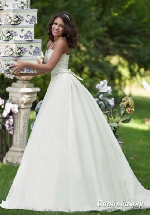 Свадебный наряд отличается плотным корсетом и пышной юбкой с небольшим шлейфом. Корсет покрыт кружевом и декорирован мельчайшими стразами, одна бретелька через шею придает образу некую игривость. Талию украшает тонкий поясок, расшитый стразами Swarovski. Свадебное платье создаст легкий, воздушный, игривый образ невесты.