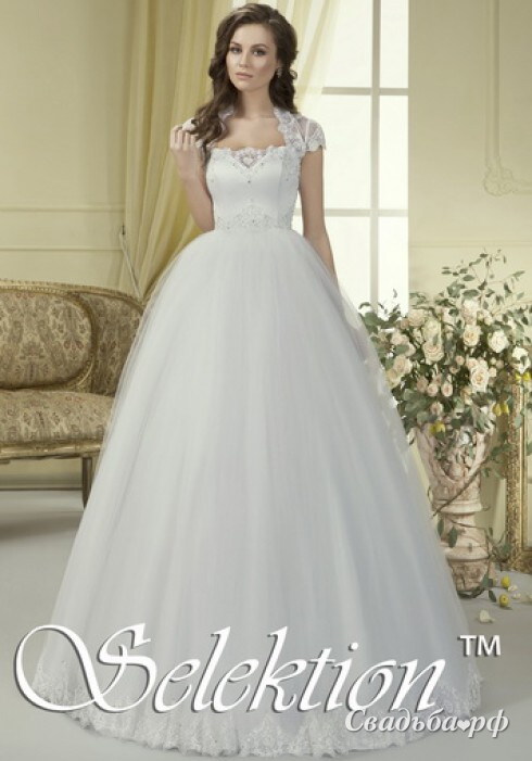 Свадебное платье в стиле принцесса с пышной фатиновой юбкой и плотным корсетом. Линия декольте прямая с небольшим V-образным декоративным вырезом. Атласный корсет сверху покрыт кружевным полотном и декорирован стразами, спина открытая, корсет сзади украшен шнуровкой. Подол юбки по кругу украшен кружевным шитьем и мелкими стразами. Болеро продается в комплекте с платьем.
