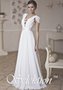 Восхитительное свадебное платье в греческом стиле очень необычного кроя. Сзади и спереди привлекают внимание глубокие и очень откровенные V-образные вырезы. На плечах аккуратные рукавчики, которые можно снять при желании. Талию украшает атласный пояс. Юбка множеством мягких складок ниспадает к полу и плавно переходит в небольшой шлейф.