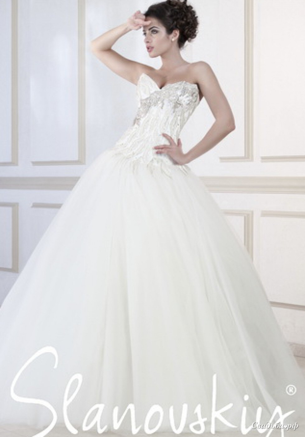 Сказочное платье Slanovskiy 13063 с пышной фатиновой юбкой и небольшим шлейфом придётся по душе самым романтичным натурам. Пикантный V-образный вырез на груди привлекает внимание к бюсту. Заниженный корсет украшен ручной аппликацией из японского бисера и стразами Swarovski. В таком эффектном свадебном платье А-силуэта каждая невеста будет счастливой Принцессой!