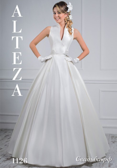 Шикарное свадебное платье А–силуэта выполнено в классическом стиле. Тугой корсет имеет необычный верх: воротник стойка и глубокий V-образный вырез. Линия талии выгодно подчеркнута симметричной россыпью бусин и страз. Пышная юбка из плотного атласа струится в пол многочисленными строгими складками. Всё это создаёт элегантный и роскошный образ невесты. Свадебный салон Anna Dress, www.anna-salon.com, тел.: 8-926-975-62-09