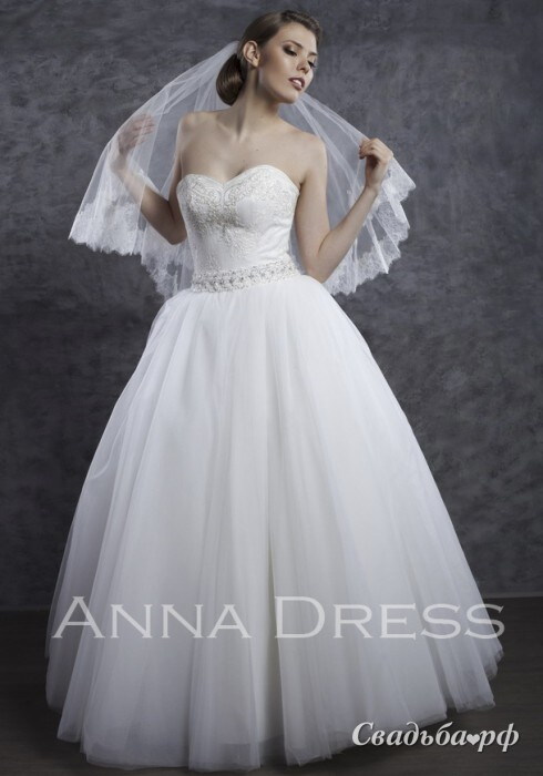 Шикарный свадебный наряд выполнен в классическом стиле. Лиф-сердечко декорирован изысканным кружевом, на талии роскошный поясок с россыпью камней и бусин. Пышная многослойная юбка из фатина струится вниз воздушными складками различной величины. В сочетании с нежной фатой эта модель поможет создать чудесный образ. Свадебный салон Anna Dress, www.anna-salon.com, тел.: 8-926-975-62-09